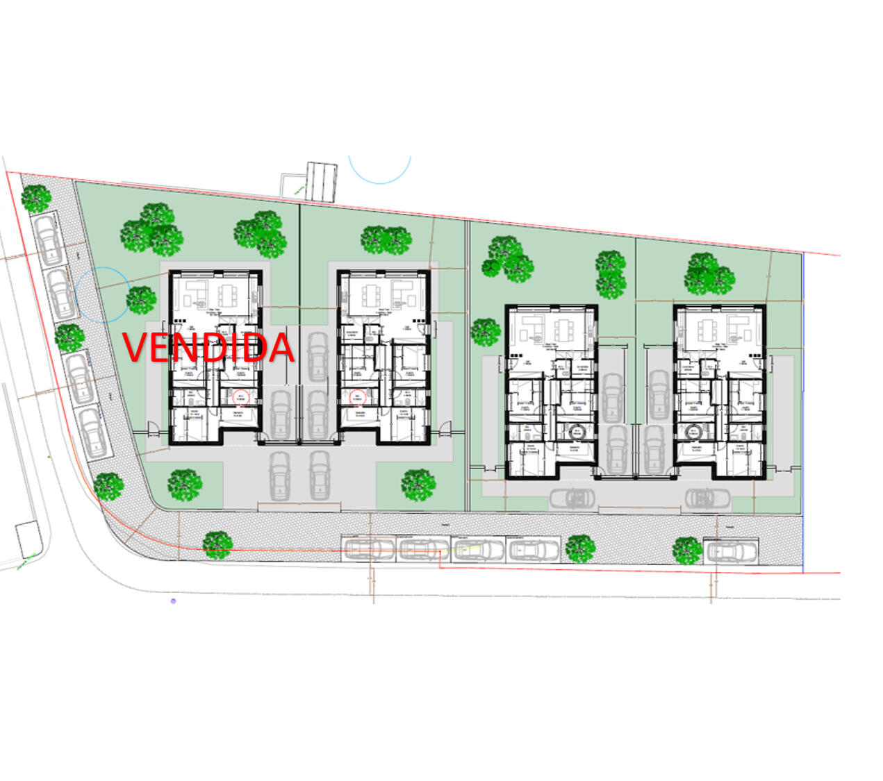 Com cerca de 130 metros de frente, em esquina, o terreno permitiu-nos desenvolver um projeto de 7 moradias em regime bifamiliar, sendo que cada propriedade terá aproximadamente 450m2 de terreno. Tal permite que, fora a area da garagem, todas as casas terão em ambos os lados um corredor superior a 3 metros de largura, proporcionando assim privacidade, luz natural e espaço exterior abundante.